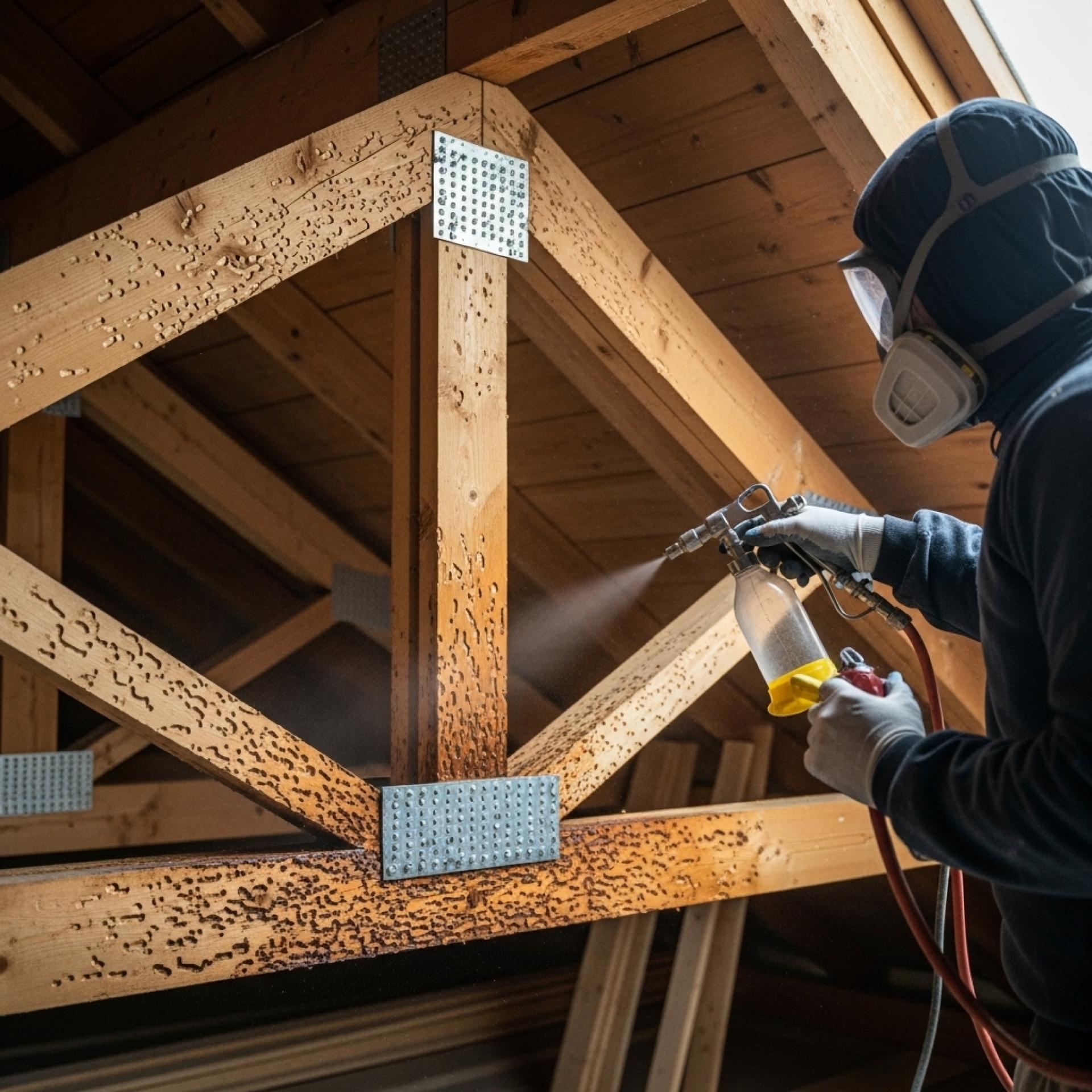 Le traitement se fait par injection et pulvérisation de produits fongicides et insecticides certifiés, avec des équipements professionnels. Ce traitement stoppe immédiatement la prolifération et protège durablement la charpente (jusqu’à 10 ans).